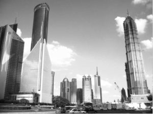 Figure 4. A vast farming land twenty years ago, Shanghai’s Pudong District has undergone rapid and massive transformation toward urbanization and now has more than three million residents. The skyscraper on the left is the fifty-three story Bank of China Tower, designed by the Japanese architectural firm Nikken Sekkei. The skyscraper on the right is the eighty-eight story Jin Mao Tower, designed by the American architectural firm SoM.