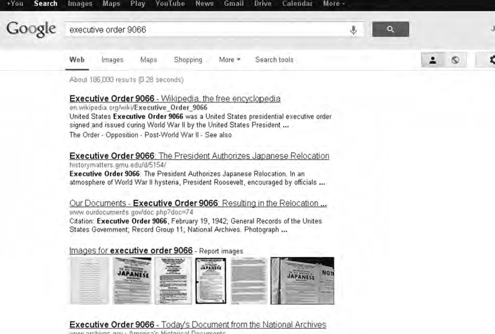 Usually, the search goal is to locate relevant, precise results on the first try, so avoid words that bloat the query. Instead of “Where in Japan is the garden named Korakuen?” use “Japan garden Korakuen” or, more simply, “Japan Korakuen.” The other words are not necessary; Google automatically eliminates words that do not relate to the search. When the search is more general than a specific person or place name, additional details may yield more useful results. Broad search terms like “Asian Music” or “Indian Spices” may not return the desired outcomes, but the results give you clues that will help refine your search. For example, “Partition India” is a less targeted search than “Partition India 1947.” The more specific the term(s), the greater the likelihood the search will return the desired results, but it may be difficult to be specific on the first search. For instance, you might be looking for the World War II document that established Japanese-American internment camps but cannot remember the document name or title. Your first search uses the terms “Japanese internment document,” which returns “Executive Order 9066.” You recognize the document name and choose this link, but you may decide to search further and use the document’s name as your second search (see Figures 1 and 2). Your second, more targeted search reveals an abundance of information on Executive Order 9066. Some searches can provide the desired information without the need to click through to the site. Here are examples of several of these quick searches:Time search: [Time Korea] will show you the current time in Korea. Weather search: [Weather Lahore] gives the current weather in Lahore. Flight arrivals and departures: [JAL3005] will give the latest information on JAL’s flight 3005. Currency: [USD in rupiah] provides the latest exchange rate for dollars and the Indonesian rupiah. Size conversions: [ten miles to kilometers] or [six quarts to liters] will instantly show results for these conversions. Definitions: [Definition noh] will give a brief definition of noh.In summary, using a small set of specific terms, sometimes in more than one search, can be a good strategy. According to Google’s “Help” literature, the words you are looking for should be in your answers, not your questions. Think about what you are hoping to find.