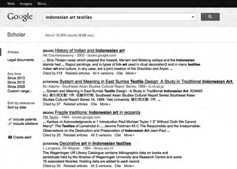Search terms in Google Scholar can be similar to those used in basic Google. The results pages are different, however. Check Figures 3 (regular Google) and 4 (Google Scholar) to see the differences in the results pages for the identical search terms. The results for Google Scholar provide the article or book title; the author; the publication date; and if it is an article, the title of the journal. In addition, there are links to “Cited by” and “Related articles.” The “Cited by” link connects to other articles that have cited this book or article and are useful to find additional, similar resources. The number of citations also gives a notion of the popularity of the article. The “Related articles” link goes to other articles on the same topic. (Some people use “cited by” to check their own publications to see who has used their work and how it is being used.) In the left pane of Scholar results are date limiters and sorting options. There is an “Alert” link that notifies you when new articles on similar subjects are released.