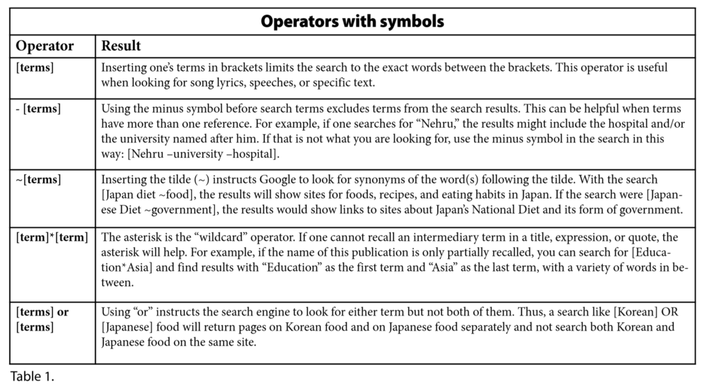 An operator is a symbol placed before one or more search terms. The function of an operator is to eliminate nonpertinent results and focus more directly on the information the user seeks. For example, when searching for a biography of Sun Yat-sen, an operator helps eliminate results pertaining to the sun. Searches normally look first for all words in a query and then look for each word individually. The further down on the list of results, the fewer the search terms found. So if you search for “A,B,C,D,E,” the first results may contain five of the terms; lower down, perhaps just four of the terms and then three of the terms were found. This is one reason that many searchers will only look at the first and second pages of the results and go no further. Type the following symbol operators directly into the search box or go to “Advanced search” under the gear symbol in the right corner of the screen, where operator choices are listed. See Table 1. There are also operators expressed with words instead of symbols. See Table 2.