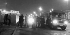 Screen capture of North Korean laborers boarding their bus after working eleven hours on a construction site in Poland. They work six days a week and are not permitted to leave the fenced compound where they live. Source: VICE documentary Cash for Kim: North Korean Forced Laborers in Poland on the VICE website at https://tinyurl.com/yafgtlow.