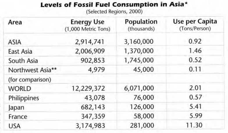 As of 1850, Asians consumed almost no fossil fuels (coal, oil, natural gas); today they consume about three billion metric tons of coal or equivalent oil and gas every year.